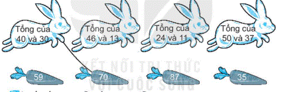 Tính nhẩm hoặc đặt tính tổng hai số ghi trên mỗi con thỏ rồi nối với kết quả tương ứng.