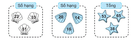 Tìm các số hạng có tổng là số ghi trên mỗi sao biển rồi ghi phép cộng tương ứng.