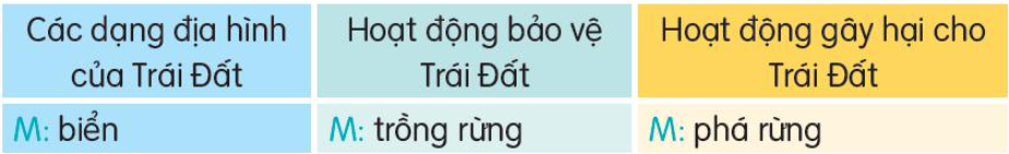 Xếp các từ ngữ dưới đây vào nhóm thích hợp. Cùng bạn hỏi – đáp về nội dung tranh. Viết vào vở câu hỏi, câu trả lời của em và bạn. Chuyển những câu dưới đây thành câu cảm hoặc câu khiến. Sưu tầm và chia sẻ với bạn tranh ảnh về Trái Đất. Viết đoạn văn tả bức tranh về Trái Đất. Trao đổi bài làm với bạn để góp ý và sửa lỗi. Bình chọn các đoạn văn hay. Tìm đọc sách báo viết về hành tinh xanh của chúng ta. Viết phiếu đọc sách theo mẫu.