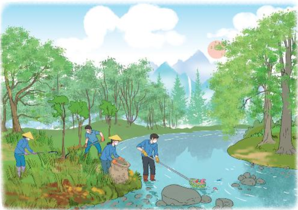 Dọn cỏ và rác để giữ gìn vệ sinh nguồn nước, bảo vệ môi trường.