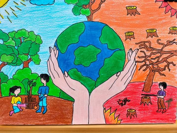 Đây là bức tranh về Trái Đất mà em yêu thích. Bức tranh được vẽ một cách inh động với hình ảnh hai bàn tay nâng quả địa cầu ở trung tâm. Hai bên chia thành hai thái cực trái ngược nhau. Một bên là hình ảnh con người đang cùng nhau trồng cây, gây rừng, bầu trời trong xanh, ấm áp. Một bên là hình ảnh con người chặt phá rừng, đốt rừng, những cảnh cây trơ trụi, tan tác. Bức tranh sử dụng những màu sắc nóng, lạnh để thể hiện rõ sự khác biệt của hai hoạt động trong tranh. Bức tranh muốn gửi gắm thông điệp rằng chúng ta hãy nâng niu Trái Đất bằng cách trồng cây, gây rừng và lên án hành vi phá hoại rừng. Ngắm nhìn bức tranh, em cảm thấy bản thân cần có trách nhiệm hơn trong việc bảo vệ môi trường, bảo vệ Trái Đất của chúng ta.