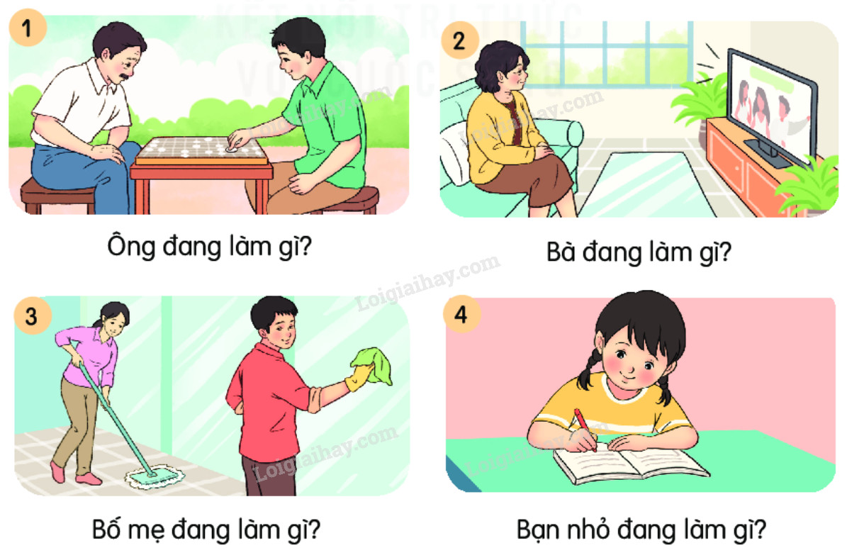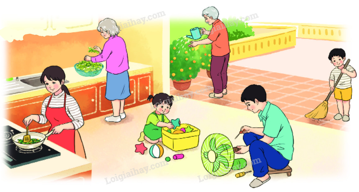 b. Chỉ hoạt động: tưới cây, nhặt rau, nấu ăn, quét sân, chơi đồ chơi, sửa quạt