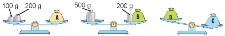 Cân nặng túi A bằng túi B, túi C nặng hơn túi B.