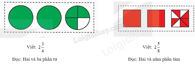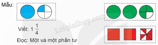 a) Viết rồi đọc hỗn số chỉ phần đã tô màu của mỗi hình dưới đây (theo mẫu).