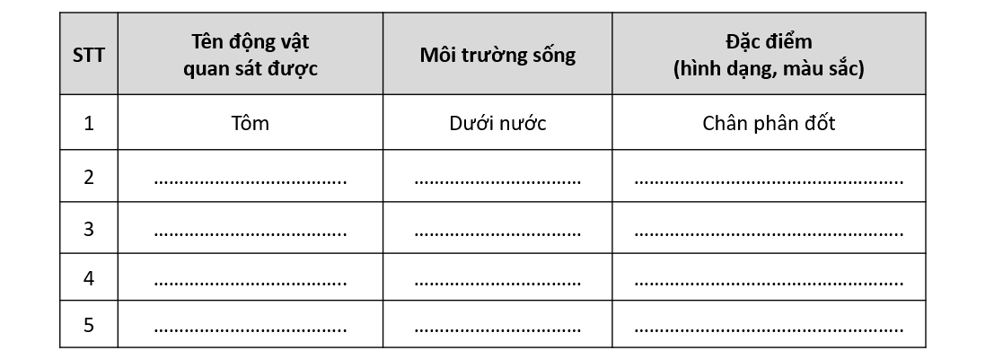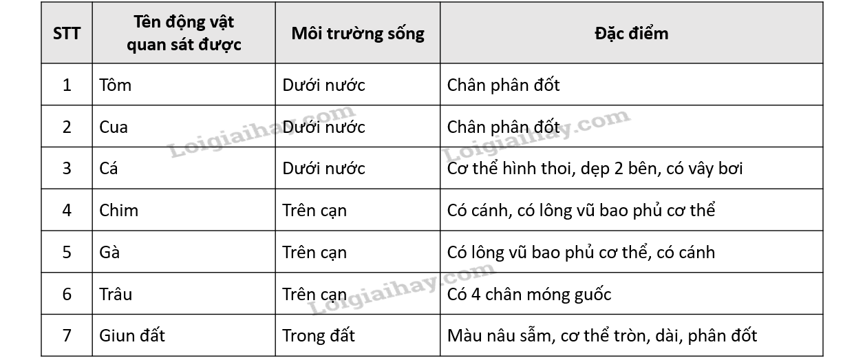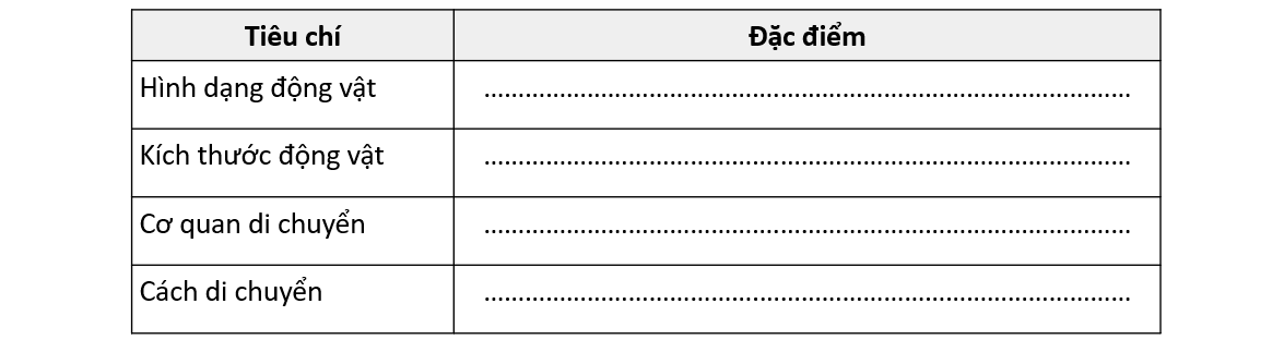 Qua quá trình quan sát động vật, hoàn thành bảng sau:
