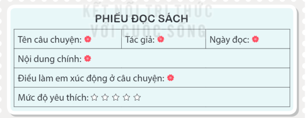 Đọc câu chuyện về tình yêu thương giữa con người với con người hoặc giữa con người với loài vật. Viết phiếu đọc sách theo mẫu. Trao đổi với bạn về nội dung câu chuyện và những điều làm em xúc động ở câu chuyện.