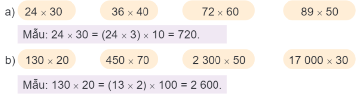 b) Tách các số tròn chục, tròn trăm thành tích của một số tự nhiên nhân với 10, 100 rồi áp dụng tính chất kết hợp của phép nhân để tính.