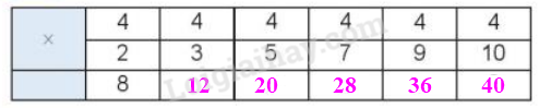 Tính nhẩm dựa vào bảng nhân 4 rồi viết kết quả còn thiếu vào ô trống.