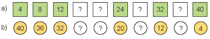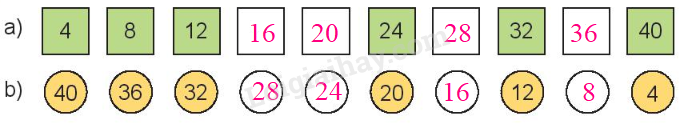 Đếm thêm 4 đơn vị hoặc đếm lùi 4 đơn vị rồi viết số còn thiếu vào ô trống.