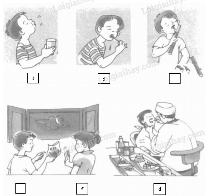 Giải câu 1 bài 6: Chăm sóc và bảo vệ răng trang 8 VBT Tự nhiên và Xã hội 1. Câu 1: Viết chữ đ vào ô trống dưới hình vẽ thể hiện việc làm đúng.