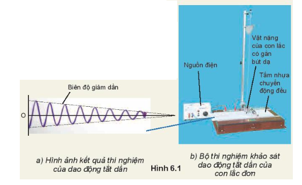 – Cho con lắc dao động ổn định và tấm nhựa chuyển động đều, bút dạ gắn ở vật nặng luôn tiếp xúc với tâm ghi đô thị. Khi con lắc dao động, bút dạ gắn trên quả nặng sẽ ghi lại biên độ dao động của con lắc đơn theo thời gian như Hình 6.1a.