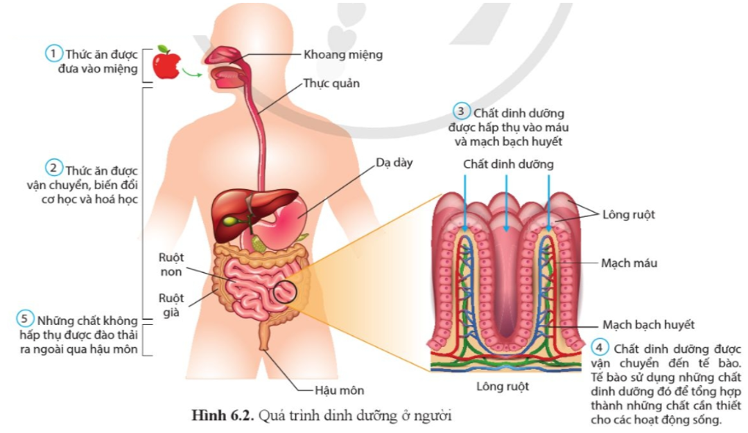 Quan sát hình 6.2, nêu tên và mô tả các giai đoạn của quá trình dinh dưỡng ở người.