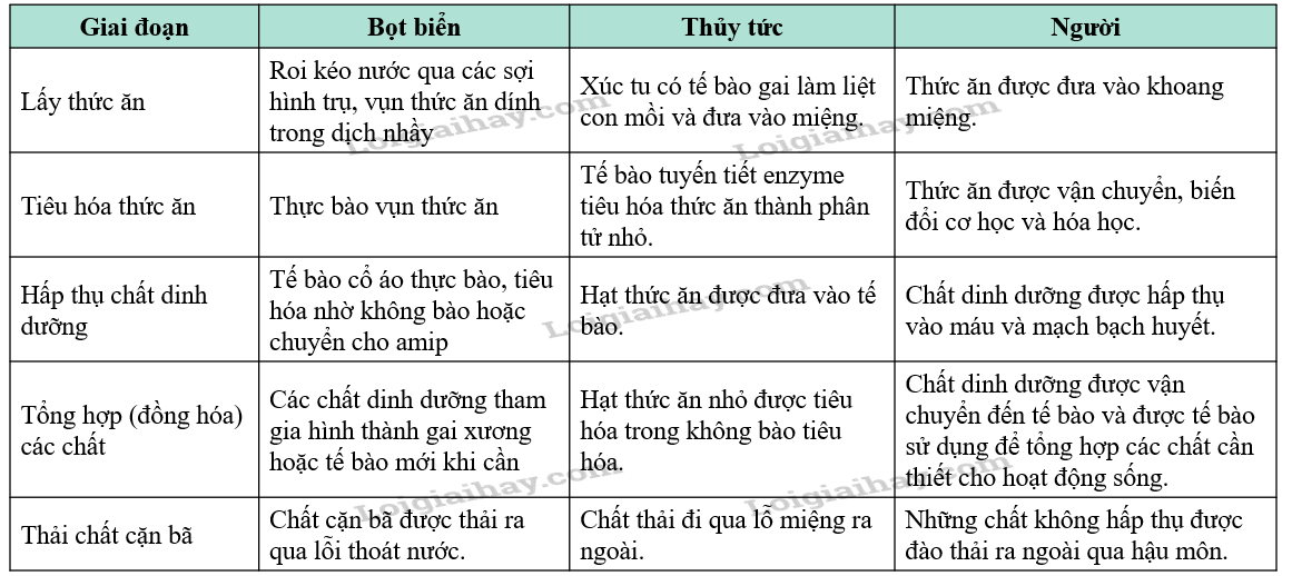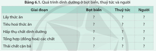 Quan sát hình 6.2, hình 6.3, hình 6.4 và mô tả đặc điểm từng giai đoạn của quá trình dinh dưỡng ở mỗi loài theo bảng 6.1.