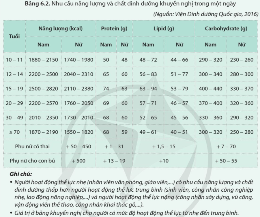 Quan sát bảng 6.2 và cho biết sự khác nhau về nhu cầu năng lượng và các chất dinh dưỡng ở các độ tuổi, giới tính, tình trạng mang thai và hoạt động thể lực. Giải thích tại sao có sự khác nhau đó.