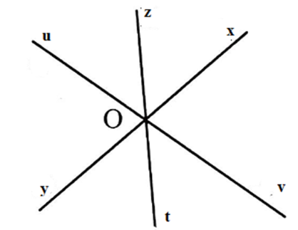 Gọi \(O\) là giao điểm của ba đường thẳng \(xy;zt;uv\). Kể tên các góc bẹt đỉnh \(O.\)