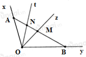 Tia \(Oz\) nằm giữa hai tia \(Ox;Oy\) nên điểm \(A;B\)  nằm khác phía đối với điểm \(M.\) Suy ra điểm \(N\) và điểm \(B\) nằm khác phía đối với điểm \(M\), do đó điểm \(M\) nằm trong góc \(yOt.\) Do đó B đúng, D đúng.