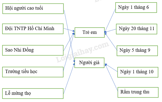 Em hãy nối những từ ngữ có liên quan đến người già hoặc trẻ em với hai ô chữ “Trẻ em” và “Người già” cho phù hợp