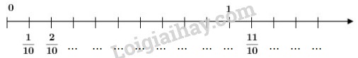 Quan sát tia số rồi điền phân số thích hợp vào chỗ chấm.