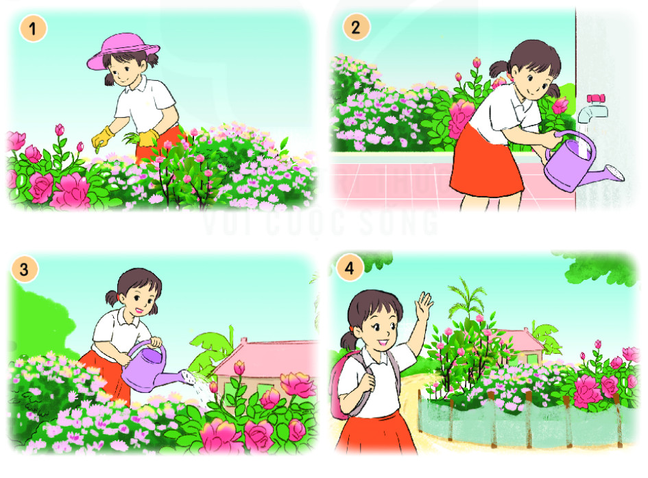– Tranh 3: Bạn nhỏ đang cầm bình tưới nước cho hoa.