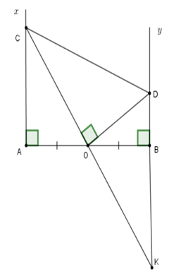 Cho đoạn thẳng \(AB,O\) là trung điểm của \(AB.\) Trên cùng một nửa mặt phẳng bờ \(AB\) vẽ các tia \(Ax;By\) vuông góc với \(AB.\) Gọi \(C\) là một điểm thuộc tia \(Ax.\) Đường vuông góc với \(OC\) tại ${\rm{O}}$ cắt tia \(By\) ở \(D.\) Khi đó