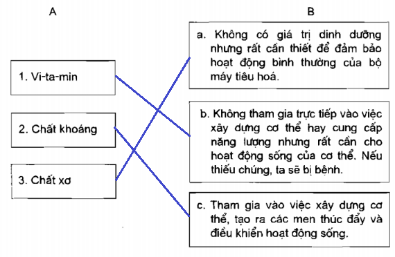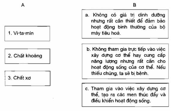 Nối các nội dung ở cột A với các nội dung ở cột B cho phù hợp với vai trò của mỗi loại chất đối với cơ thể.