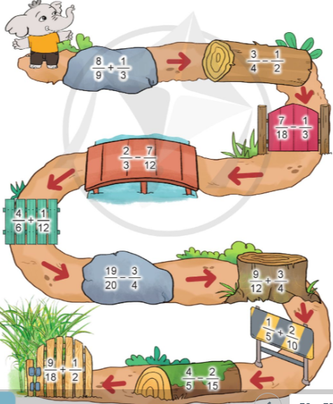 Hãy giúp bạn Voi tìm được vườn mía bằng cách thực hiện đúng các phép cộng, phép trừ hai phân số trên đường đi: