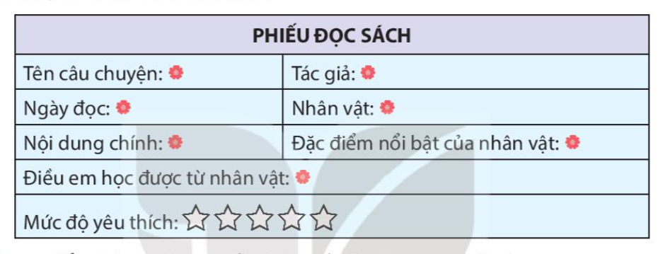 Đọc một câu chuyện có nhân vật mang đặc điểm nổi bật về ngoại hình hoặc tính cách,… (câu chuyện trong cuốn sách em mang đến lớp hoặc mượn từ tủ sách của lớp, thư viện của trường). Viết phiếu đọc sách theo mẫu. Trao đổi với bạn những điều thú vị về câu chuyện em đã đọc. Tìm trong từ điển thành ngữ một số thành ngữ nói về con người.
