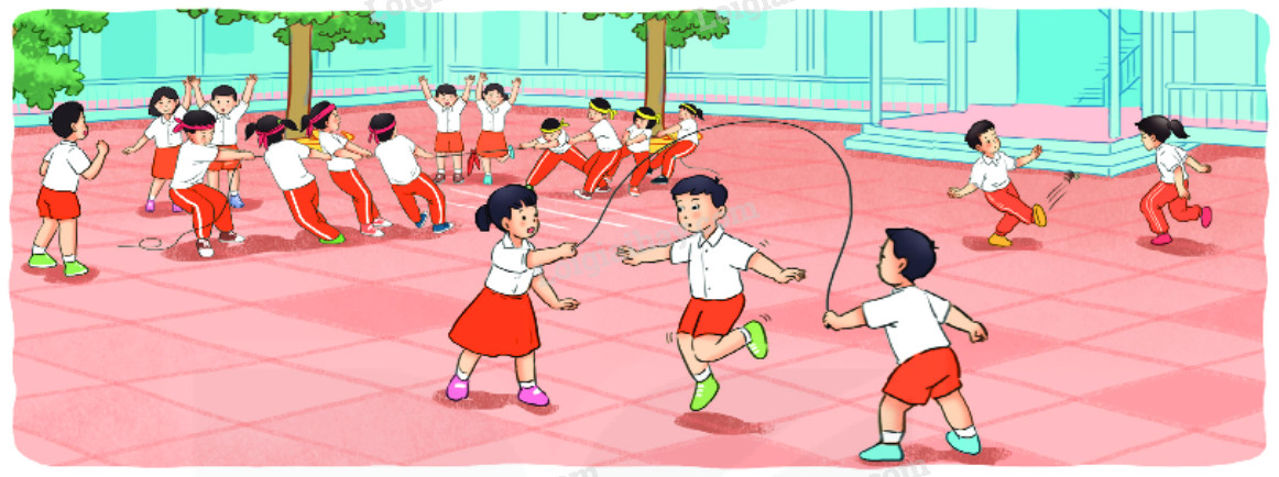Trên sân trường có ba bạn nhỏ đang chơi nhảy dây. Trò chơi nhảy dây cần ít nhất ba người chơi, hai người làm và một người nhảy. Để có thể chơi được trò chơi này, các bạn nhỏ cần phải có dây nhảy. Khi tham gia trò chơi này, ai cũng sẽ cảm thấy mệt vì phải vận động nhưng cũng rất vui vẻ và thích thú.