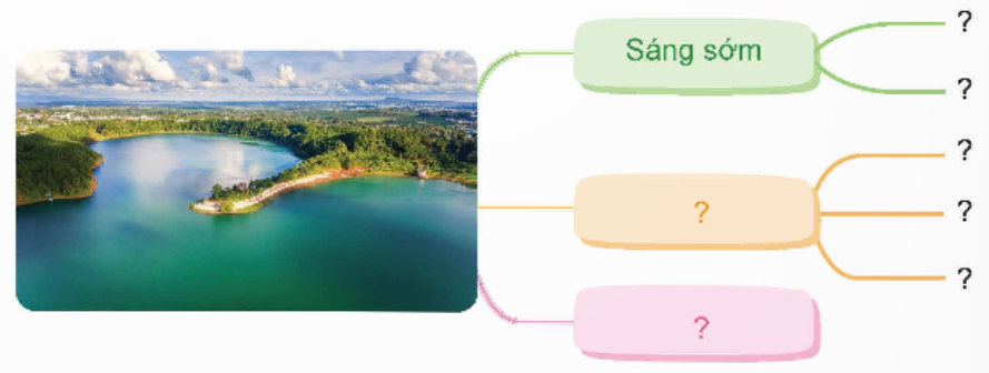 a. Hồ T’Nưng được miêu tả vào những thời điểm sáng sớm, nắng lên, hoàng hôn.