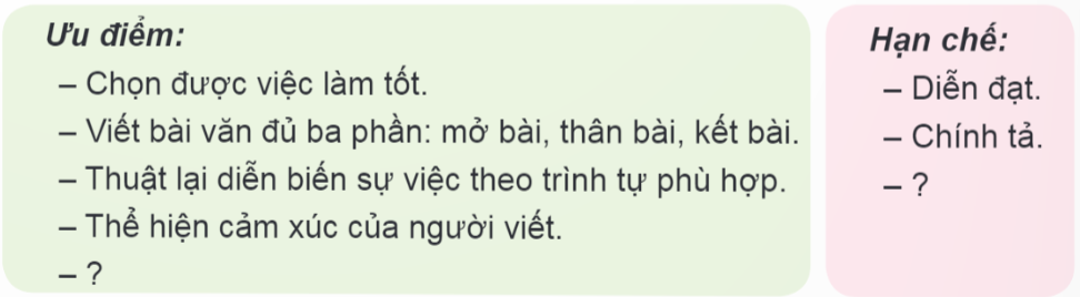 Viết bài văn thuật lại một việc tốt mà em hoặc bạn bè, người thân,…đã làm. Nghe thầy cô nhận xét chung về bài văn. Đọc lời nhận xét của thầy cô và chỉnh sửa bài viết của em. Viết lại một đoạn trong bài viết của em cho hay hơn.