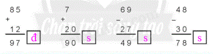 – Thực hiện tính theo cột dọc từ phải sang trái rồi điền đ, s thíc hợp vào ô trống.