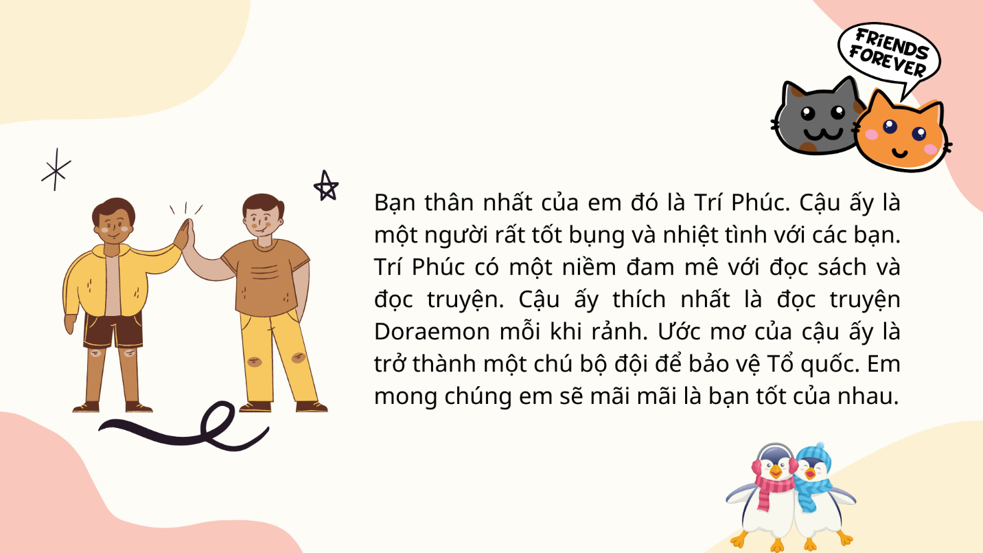 Bạn thân nhất của em đó là Trí Phúc. Cậu ấy là một người rất tốt bụng và nhiệt tình với các bạn. Trí Phúc có một niềm đam mê với đọc sách và đọc truyện. Cậu ấy thích nhất là đọc truyện Doraemon mỗi khi rảnh. Ước mơ của cậu ấy là trở thành một chú bộ đội để bảo vệ Tổ quốc. Em mong chúng em sẽ mãi mãi là bạn tốt của nhau.