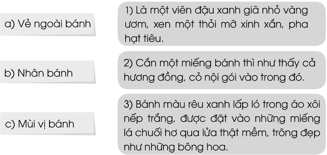 a) Những cái bánh màu rêu xanh lấp ló trong áo xôi nếp trắng được đặt vào những miếng lá chuối hơ qua lửa thật mềm, trông đẹp như những bông hoa. Nhân bánh là một viên đậu xanh giã nhỏ vàng ươm, xen một thỏi mỡ xinh xắn, pha hạt tiêu. Cắn một miếng bánh thì như thấy cả hương đồng, cỏ nội gói vào trong đó.