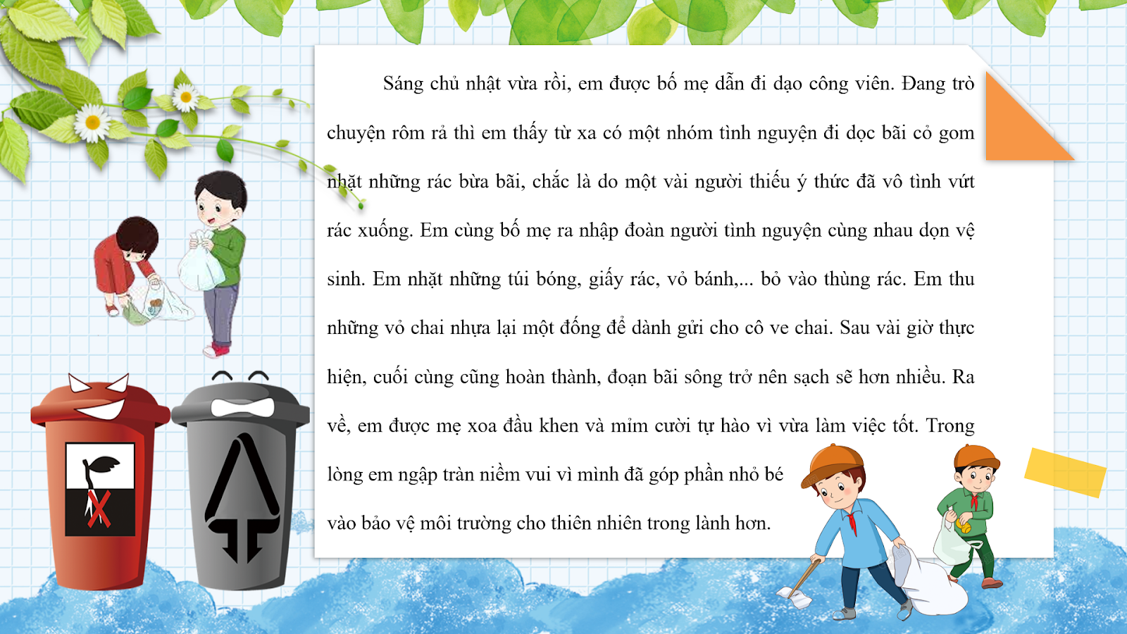 Sáng chủ nhật vừa rồi, em được bố mẹ dẫn đi dạo công viên. Đang trò chuyện rôm rả thì em thấy từ xa có một nhóm tình nguyện đi dọc bãi cỏ gom nhặt những rác bừa bãi, chắc là do một vài người thiếu ý thức đã vô tình vứt rác xuống. Em cùng bố mẹ ra nhập đoàn người tình nguyện cùng nhau dọn vệ sinh. Em nhặt những túi bóng, giấy rác, vỏ bánh,… bỏ vào thùng rác. Em thu những vỏ chai nhựa lại một đống để dành gửi cho cô ve chai. Sau vài giờ thực hiện, cuối cùng cũng hoàn thành, đoạn bãi sông trở nên sạch sẽ hơn nhiều. Ra về, em được mẹ xoa đầu khen và mỉm cười tự hào vì vừa làm việc tốt. Trong lòng em ngập tràn niềm vui vì mình đã góp phần nhỏ bé vào bảo vệ môi trường cho thiên nhiên trong lành hơn.