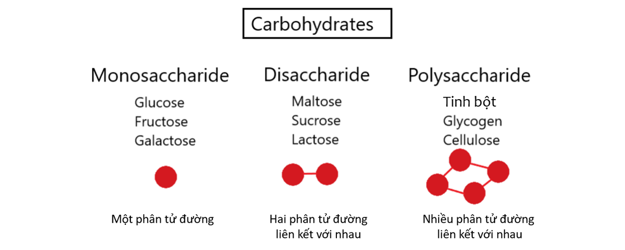 Carbohydrate được chia thành 3 nhóm tùy theo số lượng đơn phân trong phân tử: đường đơn (monosaccharide); đường đôi (disaccharide) và đường đa (polysaccharide).