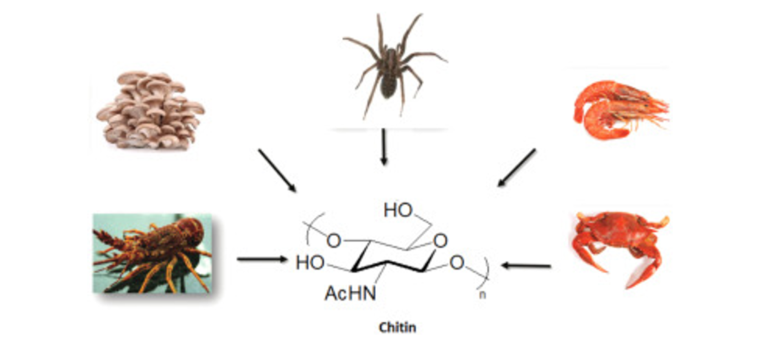 Chitin cũng được xếp vào nhóm đường đa (polysaccharide), từ nhiều phân tử glucose. Chitin là thành phần chính cấu tạo nên vỏ ngoài của tôm, cua, nhện và các loài nấm.
