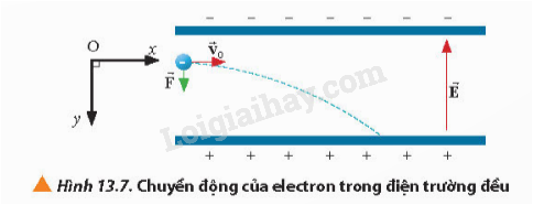 – Trên phương Oy: Lực điện \(\overrightarrow F \) gây ra gia tốc \(\overrightarrow a  = \frac{{{q_0}\overrightarrow E }}{m}\). Electron chuyển động thẳng nhanh dần đều không vận tốc ban đầu