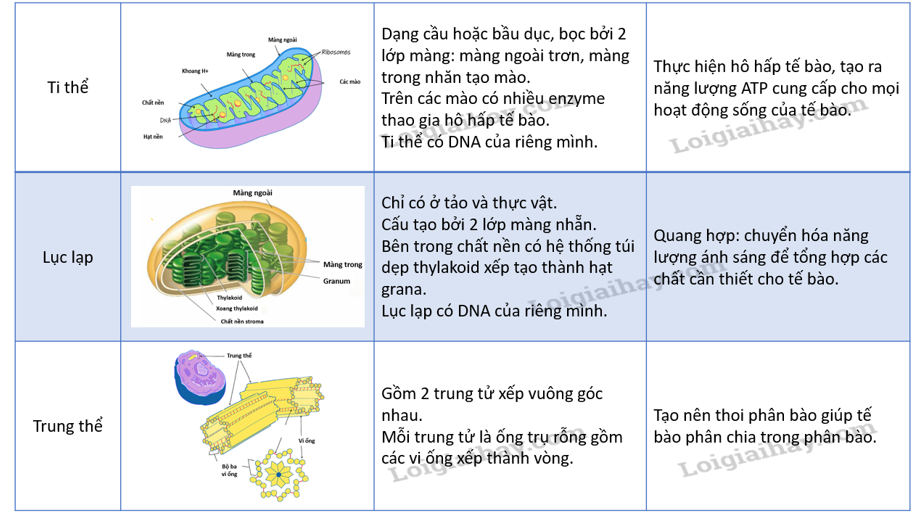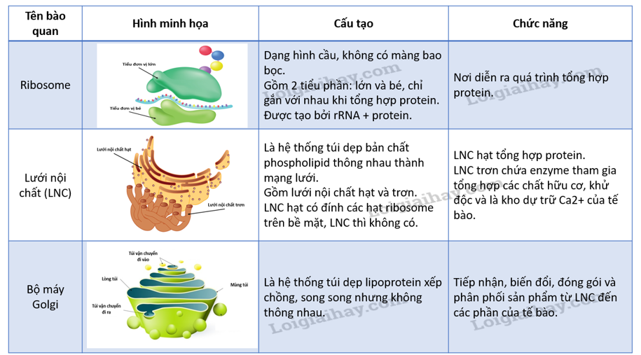 Để có cái nhìn bao quát hơn về cấu tạo và vai trò của các bào quan, em hãy quan sát bảng dưới đây: