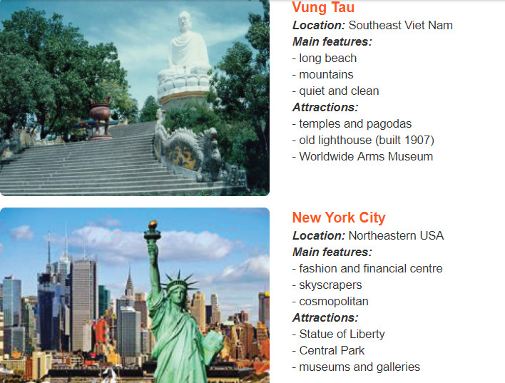 (Đọc thông tin về 3 thành phố sau và tìm chúng trên bản đồ.)