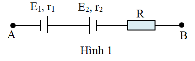 Cho đoạn mạch như hình vẽ (Hình 1) trong đó \({E_1} = 9V,{\mkern 1mu} {\mkern 1mu} {r_1} = 1,2\Omega ;{\mkern 1mu} {\mkern 1mu} {E_2} = 3V,{\mkern 1mu} {r_2} = 0,4\Omega ;\) điện trở \(R = 28,4\Omega \). Hiệu điện thế giữa hai đầu đoạn mạch \({U_{AB}} = 6V\). Dòng điện chạy qua đoạn mạch có