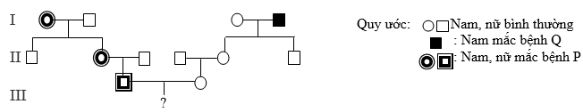 Bệnh P được quy định bởi gen trội (P) nằm trên nhiễm sắc thể thường; bệnh Q được quy định bởi gen lặn (q) nằm trên nhiễm sắc thể giới tính X, không có alen tương ứng trên Y. Biết rằng không có đột biến mới xảy ra. Xác suất để cặp vợ chồng ở thế hệ thứ III trong sơ đồ phả hệ trên sinh con đầu lòng là con trai và mắc cả hai bệnh P, Q là bao nhiêu ?
