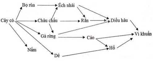 (2) đúng (vì có 2 mũi tên đi vào, 2 mũi tên đi ra): cây cỏ – bọ rùa – ếch – diều hâu – VK; cây cỏ -châu chấu – ếch – diều hâu – VK; cây cỏ – bọ rùa – ếch – rắn – VK; cây cỏ -châu chấu – ếch – rắn – VK