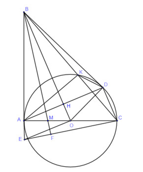 Cho  tam giác ABC vuông tại A, đường tròn \(\left( O \right)\)đường kính AC cắt BC tại K, vẽ dây cung AD của \(\left( O \right)\) vuông góc với BO tại H