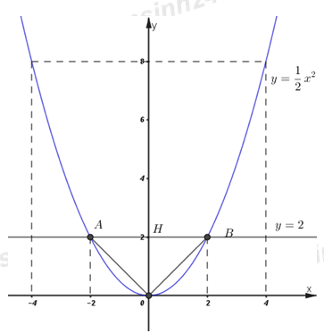 Đường thẳng \(y = 2\) cắt \(\left( P \right)\) tại hai điểm phân biệt \(A\left( { – 2;\;2} \right)\) và \(B\left( {2;\;2} \right).\)