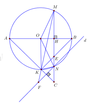 Cho đường tròn tâm \(\left( {O;R} \right)\) có đường kính AB vuông góc với dây cung MN tại H (H nằm giữa OB). Trên tia MN lấy điểm C nằm ngoài đường tròn \(\left( {O;R} \right)\) sao cho đoạn thẳng AC cắt đường tròn \(\left( {O;R} \right)\) tại điểm K (K khác A), hai dây MNBK cắt nhau ở E.