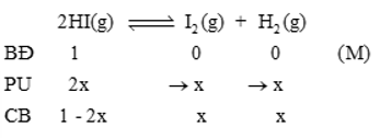 %HI bị phân hủy = \(\frac{{{C_{H{I_{(pu)}}}}}}{{{C_{H{I_{(bd)}}}}}}.100\% {\rm{ \;}} = \frac{{2x}}{1}.100\% {\rm{ \;}} = \frac{{2.0,0909}}{1}.100\% {\rm{ \;}} = 18,18\% \)