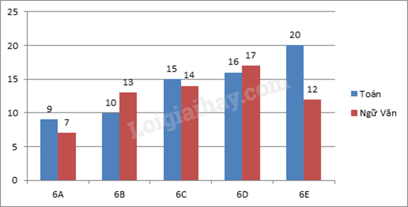 Biểu đồ cột kép dưới đây biểu diễn số học sinh giỏi hai môn Toán và Ngữ văn của các lớp 6A, 6B, 6C, 6D và 6E