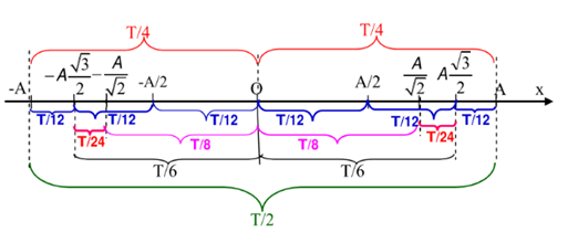 + Khoảng thời gian giữa 2 lần liên tiếp vật có vận tốc bằng 0 là \(\frac{T}{2}\)