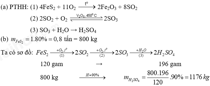 (b) Tính thể tích dung dịch H2SO4 95% (D = 1,82 g/mL) thu được từ 1 tấn quặng pyrite (chứa 80% FeS2). Biết hiệu suất của cả quá trình là 90%, các tạp chất trong quặng không chứa sulfur.