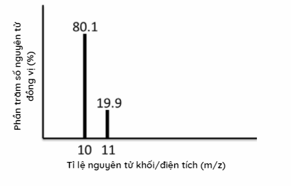 Phổ khối lượng của nguyên tố X được cho ở hình 1.34. Nguyên tử khối trung bình của nguyên tố này là bao nhiêu?